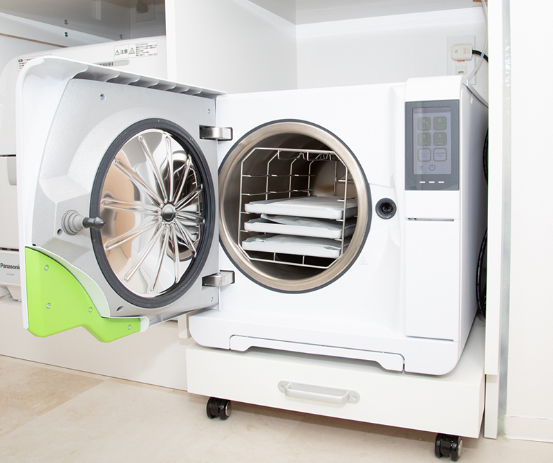 当院で使用しているクラスBは、ヨーロッパ規格EN13060の最も厳しい基準を満たした滅菌器です。中を真空状態にして滅菌するため、ハンドピースや滅菌パックに入った器具を含めすべての種類の器具に対応することができます。