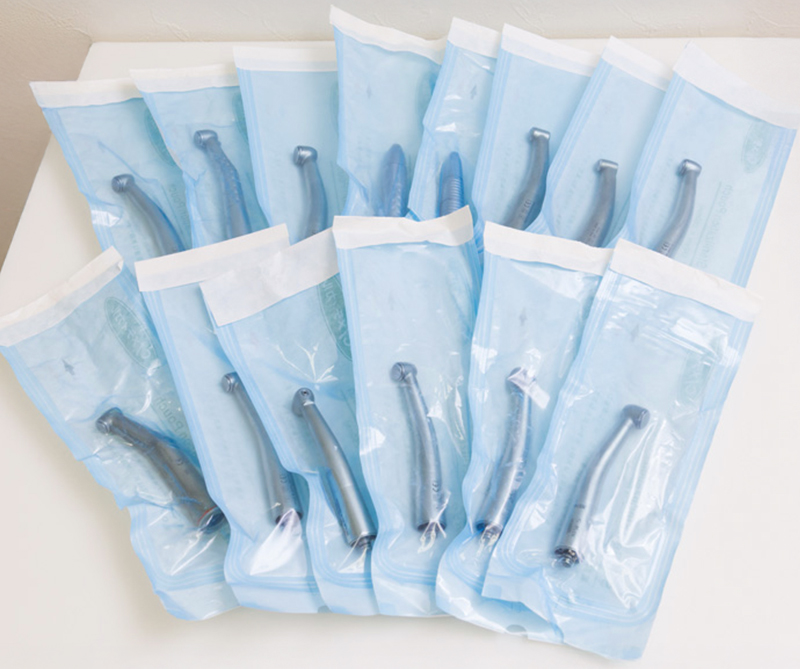 当院では、滅菌パックに入れて器具の滅菌を行っています。滅菌が完了し、無菌状態になった器具を滅菌パックに入れた状態で保管し、患者さんの治療の直前に滅菌パックを開封します。